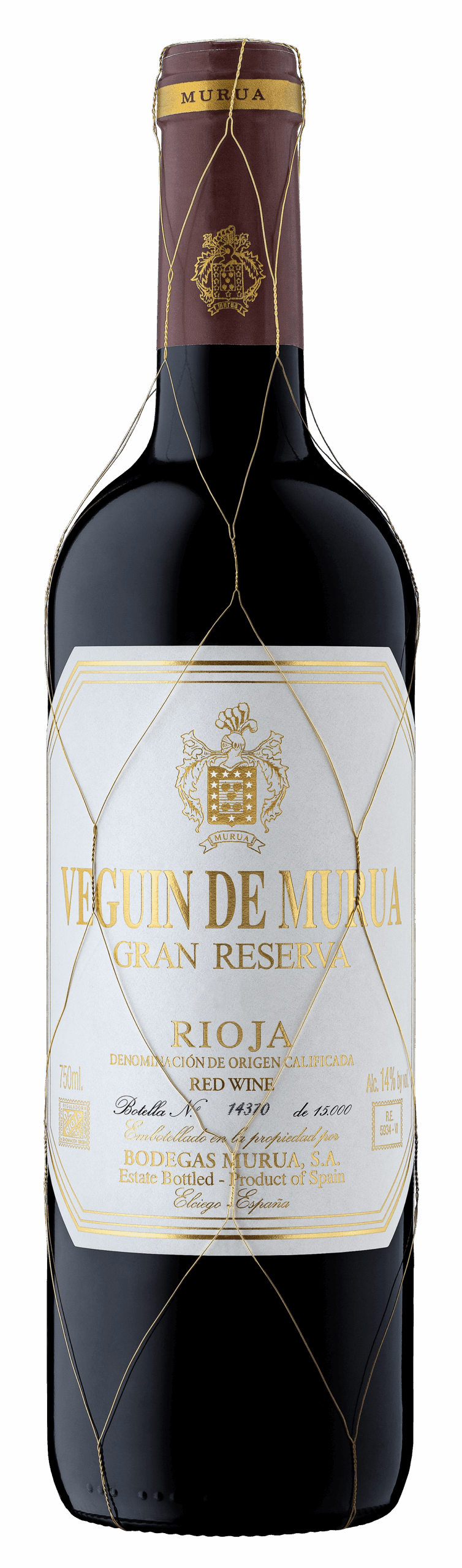Veguín de Murua Gran Reserva 2015 es un vino tinto de la D.O.Ca. Rioja, elaborado con 92% Tempranillo y 8% Graciano. Procede de viñedos centenarios de baja producción y cuenta con una crianza de 25 meses en barricas nuevas de roble francés y americano. Complejo, elegante y potente, es ideal para acompañar carnes y platos de caza. Edición limitada y presentado en estuche premium.